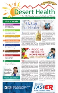 www.Societyofthefew.org www.DesertHealthNews.com November/December 2025 Desert Health® The Valley's Leading Resource for Health and Wellness 2 Lauren Del Sarto* FOUNDER/PUBLISHER An Independent Publication www.DesertHealthNews.com lauren@deserthealthnews.com • (760) 238.0245 @DesertHealthNews Distribution: Desert Health is distributed at 350+ locations throughout the Coachella Valley, including but not limited to, grocery stores, doctors’ offices, cafes and restaurants, spas, fitness centers and clubhouses. Please call for delivery to your retail location. Desert Health® is a California Corporation. All rights reserved. Reproduction in any form, in whole or in part, without the written consent of the Publisher is prohibited. The opinions and views expressed in these pages are those of the writer or persons interviewed and not necessarily those of Desert Health®. Desert Health® hereby expressly limits its liability resulting from any and all misprints, errors and/or inaccuracies any advertisement or editorial may contain. This publication is printed on paper sourced from sustainable forests and farms. Thank you to the Desert Health® team and all our marketing partners! Home delivery subscriptions available. Call (760) 238.0245. Get free delivery to your place of business. MADE POSSIBLE BY OUR ADVERTISERS THANK YOU FOR SUPPORTING THEIR BUSINESSES! Trish Lounsbury DISTRIBUTION Benjamin Katz WEB MASTER benjaminkatzcreative.com Doris Steadman A LITTLE OF EVERYTHING Carlotta Rinke,* MD, MBA LEAD EDITOR James Thomas DISTRIBUTION Heather McKay GRAPHIC DESIGN mkaydesign.com *Photo by Lani Garfield Lauren Del Sarto Founder/Publisher Founder of BronwynIson.com and EvolveYogaOnline.com. Bronwyn is featured on Women’s Health, NBC and Fox News Hightower Advisors, LLC is an SEC registered investment adviser. Securities are o ered through Hightower Securities, LLC. Member FINRA/SIPC. JJ VIRGIN KEYNOTE SPEAKER STEPHANIE LINK KEYNOTE SPEAKER EMPOWER YOURSELF NOW! BRONWYN ISON CEO/CO HOST 2026 CONFIDENCE SUMMIT Saturday, February 28, 2026 • The Ritz-Carlton, Rancho Mirage, California BRONWYN BronwynIson.com EvolveYogaOnline.com. on NBC News Revolutionary health leader, triple-board certi ed nutrition expert, Fitness Hall of Famer, and a passionate advocate for the healing power of food and exercise. VIRGIN KEYNOTE Revolutionary triple-board expert, a for the food and a for FEATURED SPEAKERS Wellness Session by Lauren Del Sarto For more information and to reserve your seat visit www.SocietyoftheFEW.org Host City Sponsor Founder and LINK SPEAKER SPEAKERS Featured on CNBC and frequently appears on the Halftime Report, Squawk Box, The Closing Bell, and Power Lunch. Presenting Sponsor 2 Desert Health Dear Friends, As we present our holiday edition to you, we turn the page on our 15th anniversary year. Desert Health is truly a community effort, and I am so grateful for all who have brought us here today: the caring doctors, practitioners and health organizations at the heart of who we are, who continue to contribute educational editorial. They share our values and desire to empower readers to be their own best advocates for good health and happiness. We wouldn’t be here without our advertisers who allowDesert Health to continue as a complimentary publication. I am proud to say that we have never had a sales team; 100% of our advertisers reach out to join us. 30% have been with us for over a decade, and 55% for five or more years. Desert Care Network (our very first advertiser), Eisenhower Health, Live Well Clinic, AcQpoint Wellness Center, Movement for Life, Younes Medical andClark’s Nutrition have been with us since our first year. I owe much gratitude to each and every one of our marketing partners, andthank you for supporting their businesses. Our team: the talented Heather McKay, our graphic designer since day one (we are soul sisters who share the same birthday); Webmaster Benjamin Katz who makes us look good online; Chase Shoemaker, our incredible printing partner since day one, and Mom (aka Doris), who at 86 years young is still the face of Desert Health at many events (I won’t let her retire). Trish Lounsbury, an invaluable part of our distribution team, joined by Jimmy Thomas, and our newest edition, Editor Carlotta Rinke, MD, MBA, who has recently added ‘author’ to her title. Last, but certainly not least, my husband, who has put up with all our crazy deadlines and once proclaimed that he hopes to come back as a No. 2 pencil. But most of all, you, our readers. Your appreciation, health achievements and good tidings keep us going. We love hearing from you and thank you for all your support over the years. Here’s to many more! Wishing you much health and happiness this holiday season ~